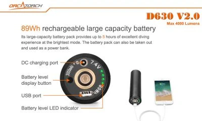 OrcaTorch D630 V2.0 is a perfect canister dive light for cave diving, wreck diving or similar technical diving activities. The light delivers up to 4,000 lumens, and its angle adjustable cable allows both 90°and 180° rotation between the canister and light head. This makes the OrcaTorch D630 V2.0 perfectly suited for both side mount and back mount diving. Its large-capacity battery pack provides up to 5 hours of excellent diving experience at the brightest mode. The battery pack can also be taken out and used as a power bank
